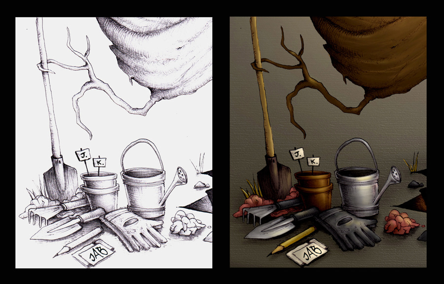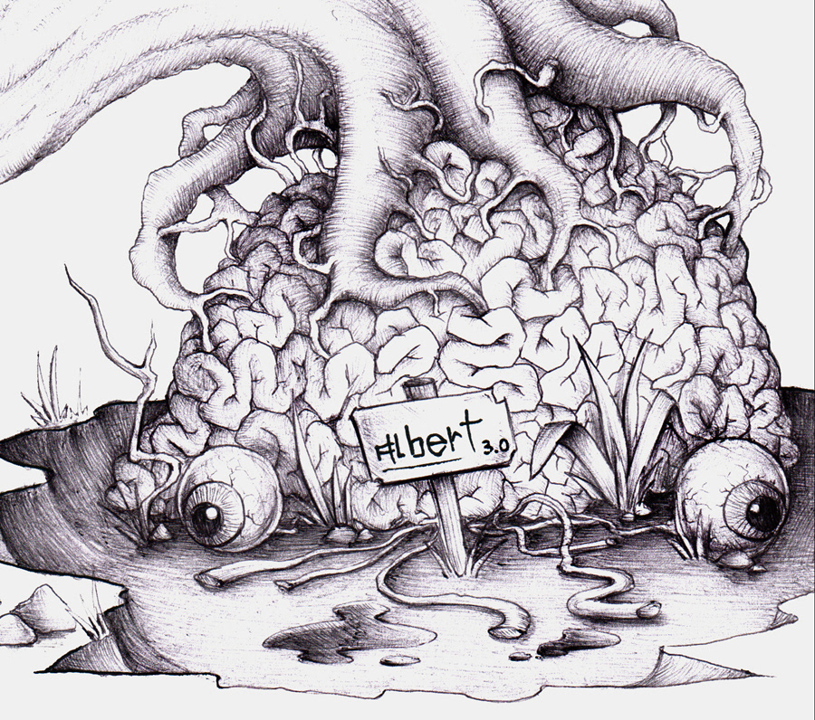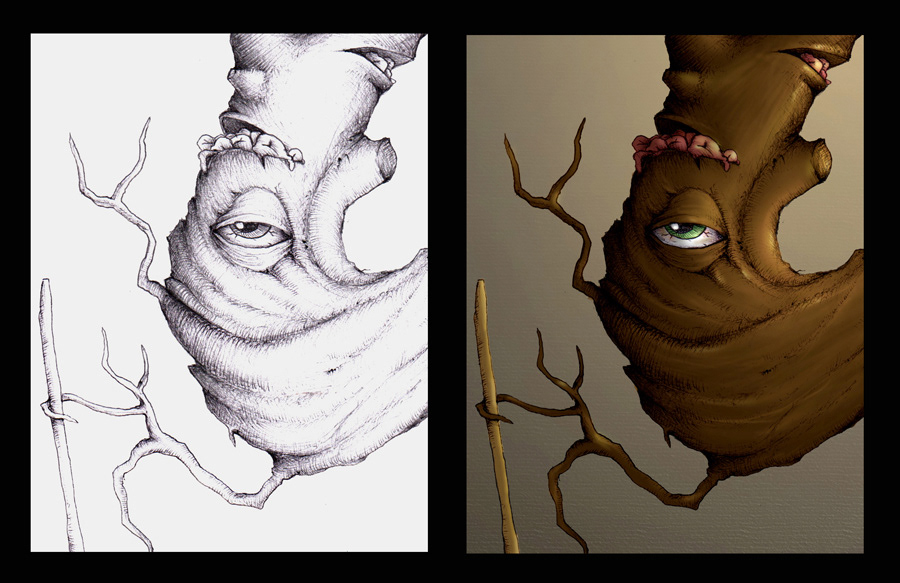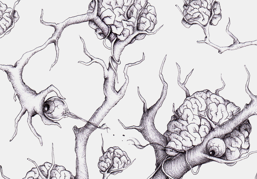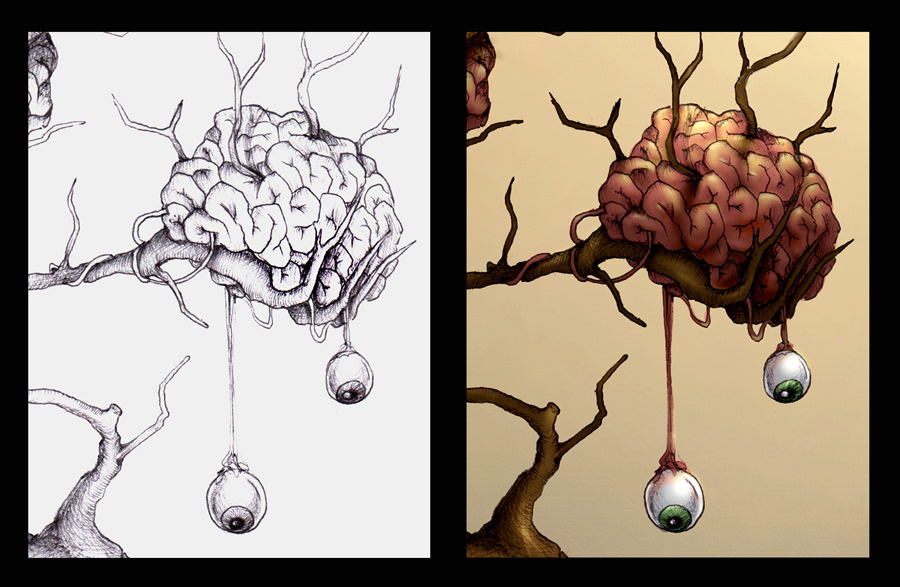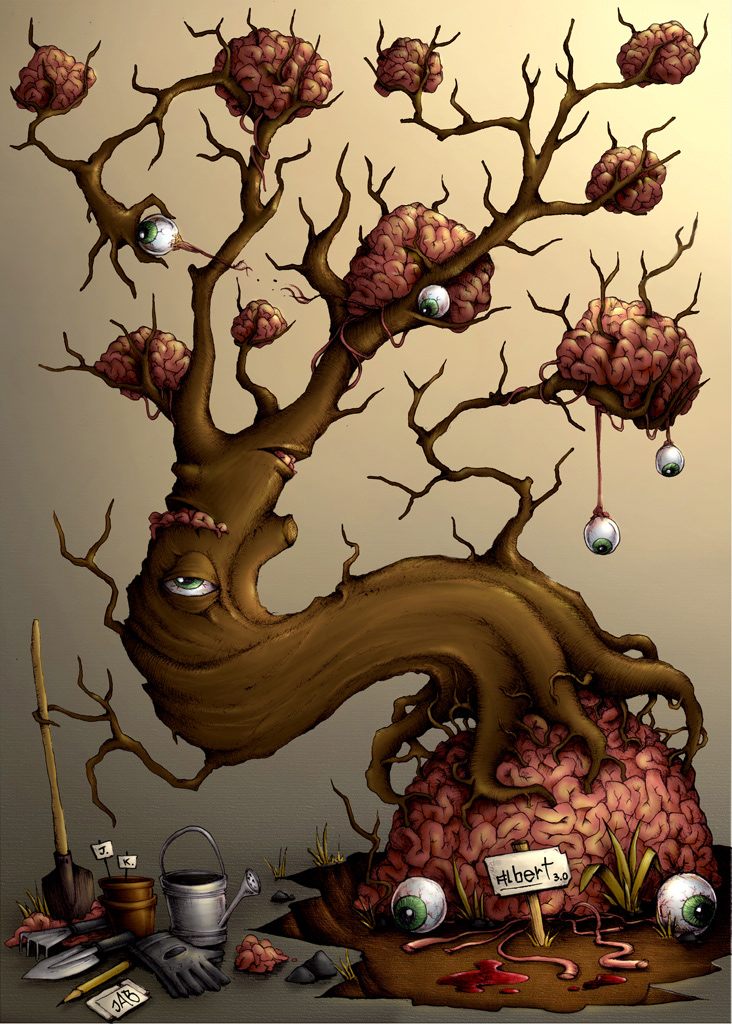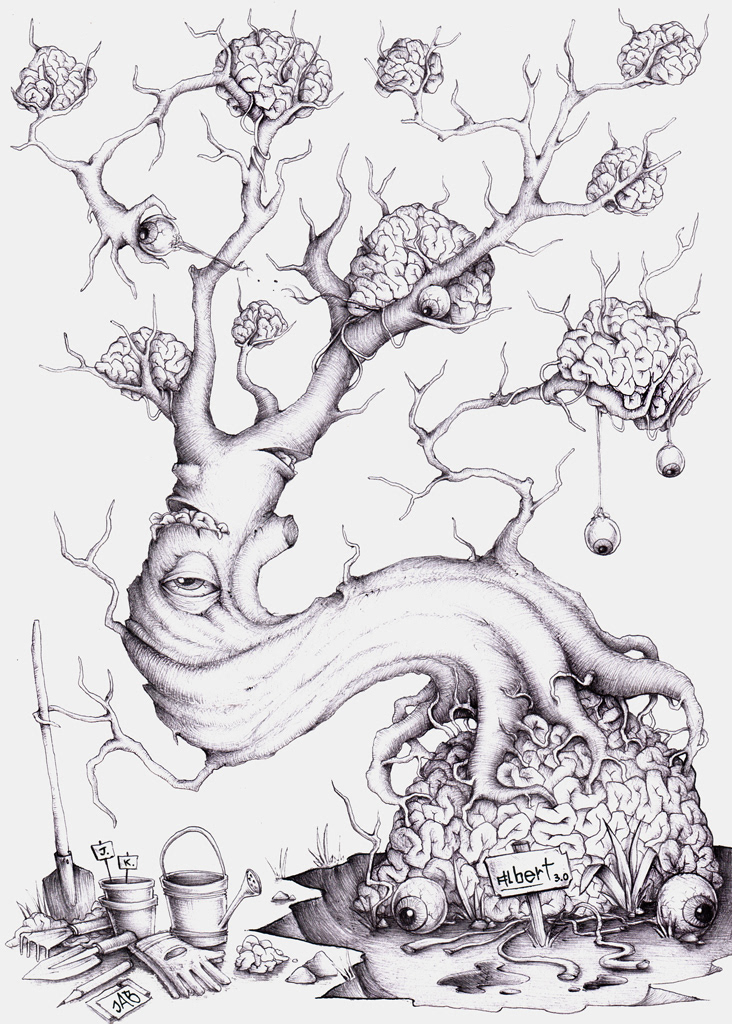 The Work rappresents a Tree that grows on a brain developping other brains. It means that....from the knowledege can develop more knowledge. Made with ballpoint pen on paper and colored with a digital painting technique.
