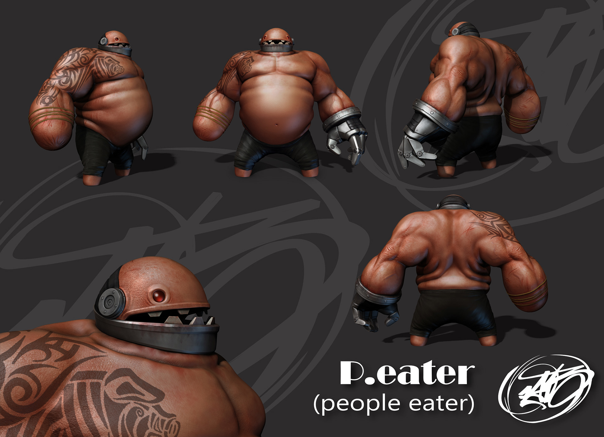 The work rapresents a cannibal butcher and his name is "P.EATER" P.eater is a wordplay that means "People Eater" and the diction recall a person proper name as Peter. Made with a sculpting digital technique