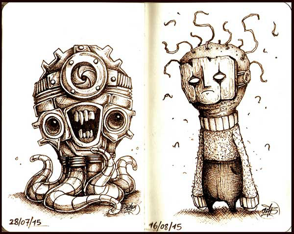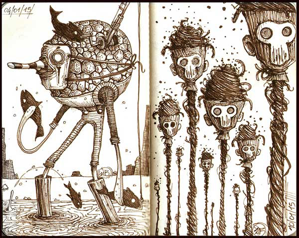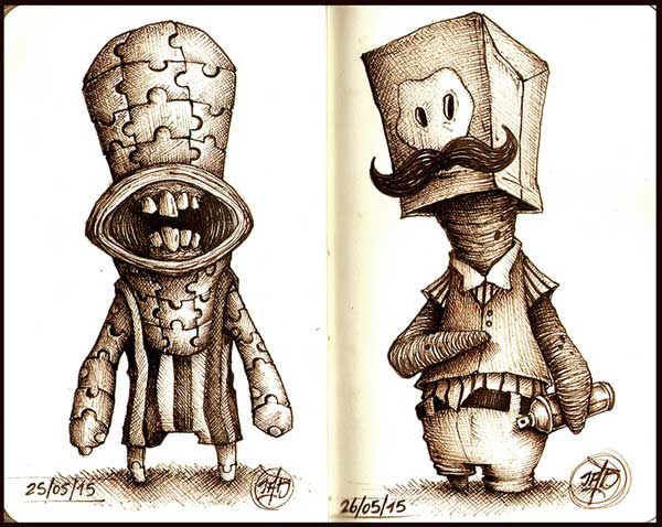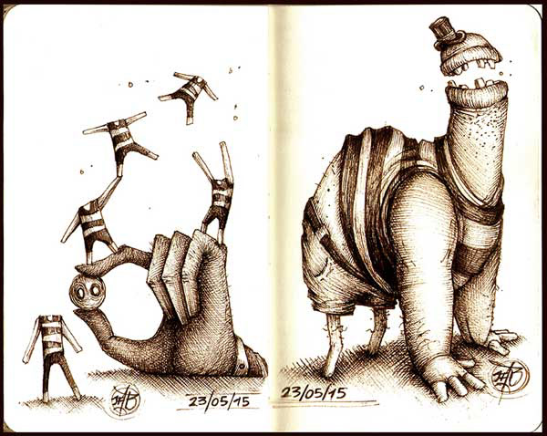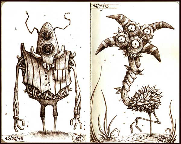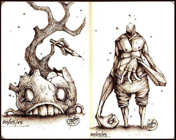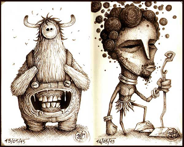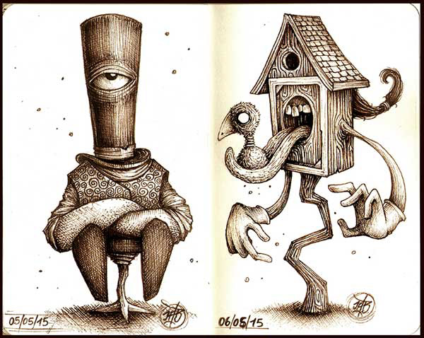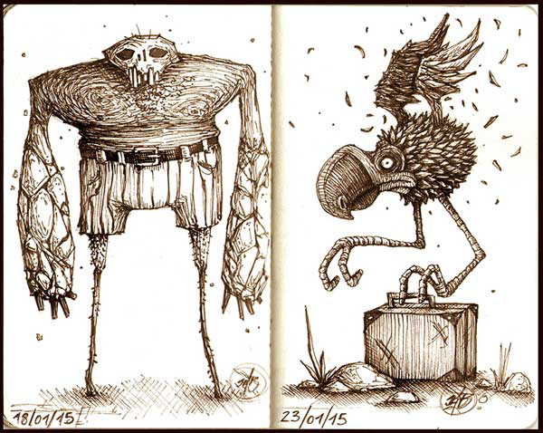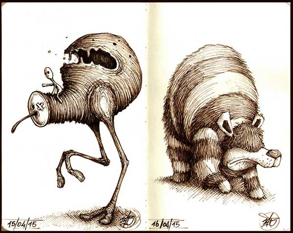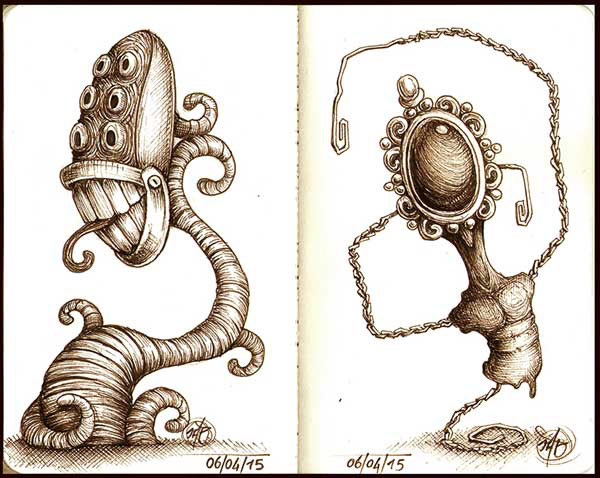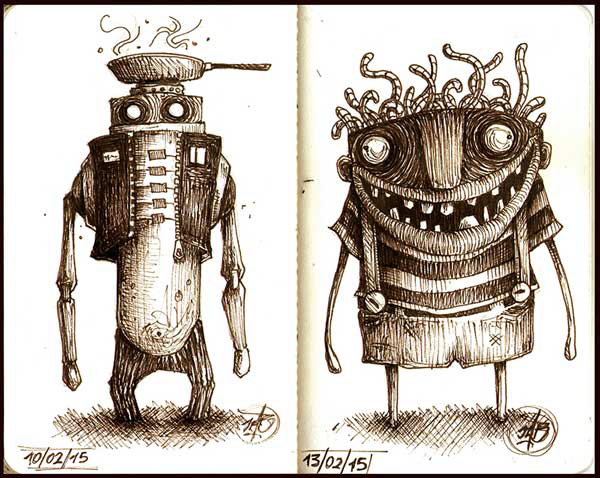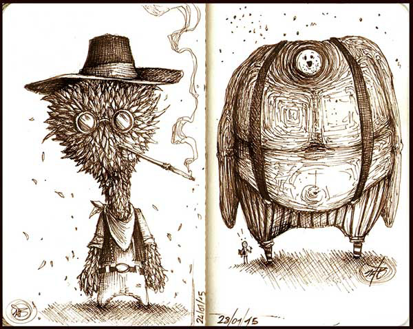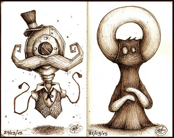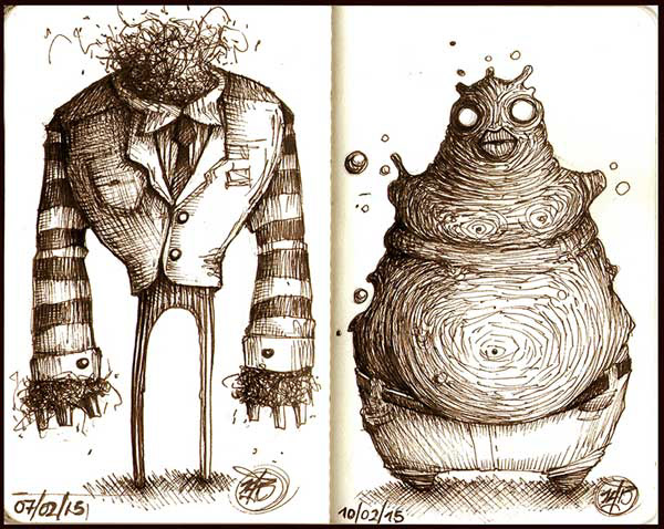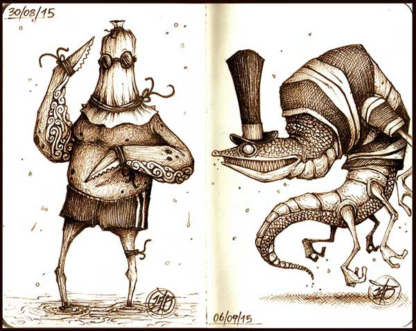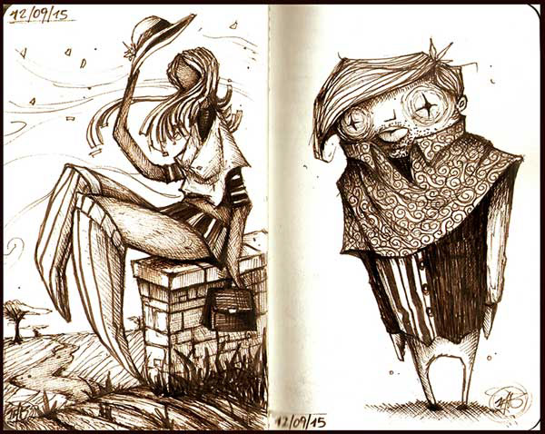 Series of quick concepts made with Sepia Pens on sketchbook 16x10 cm