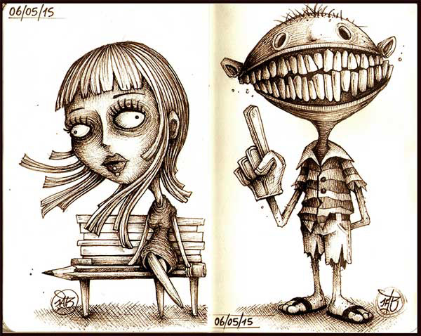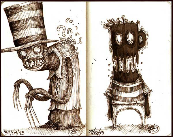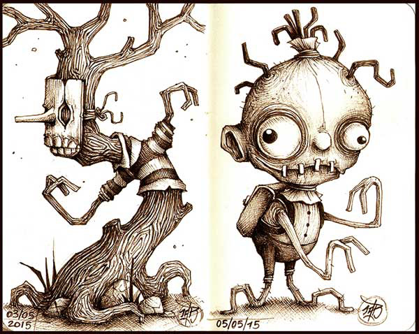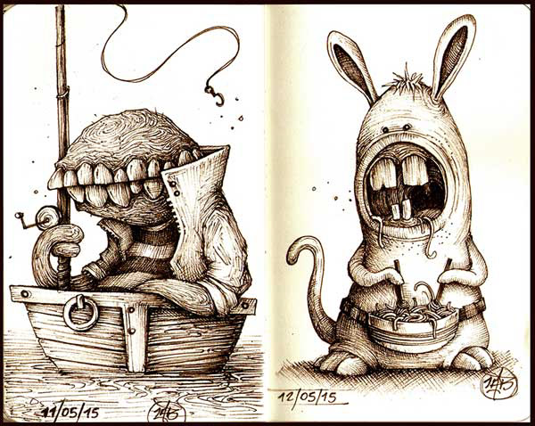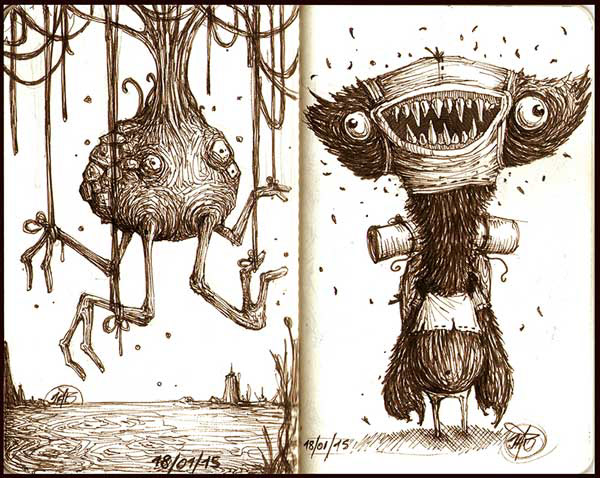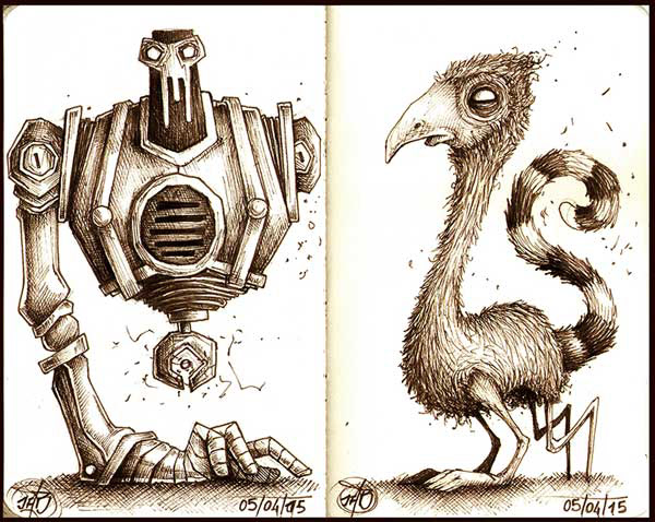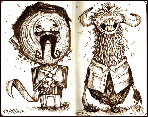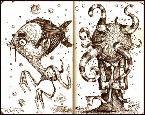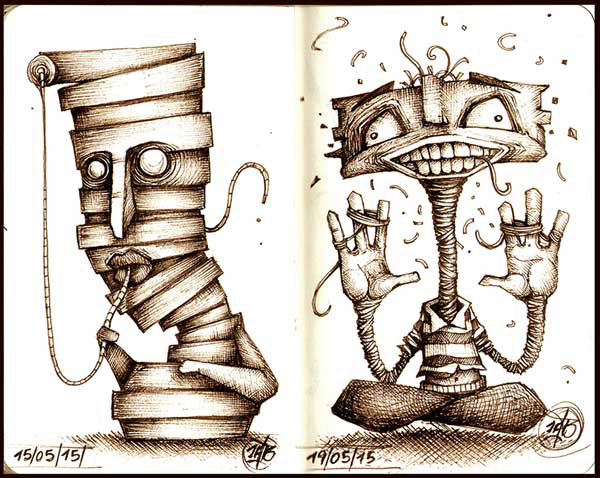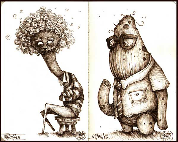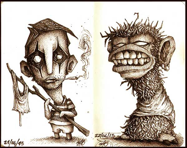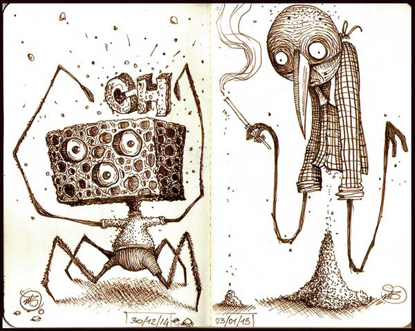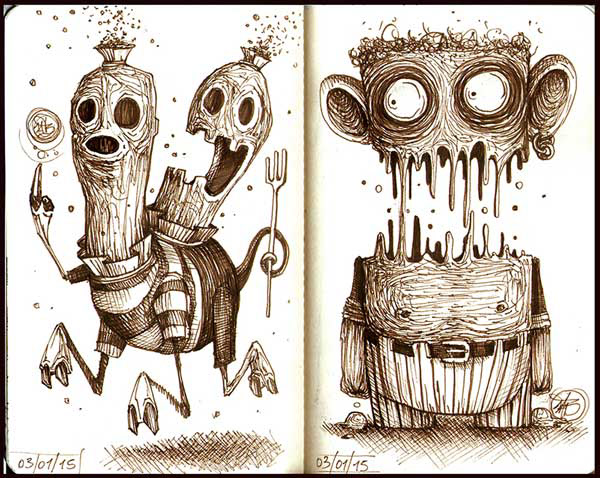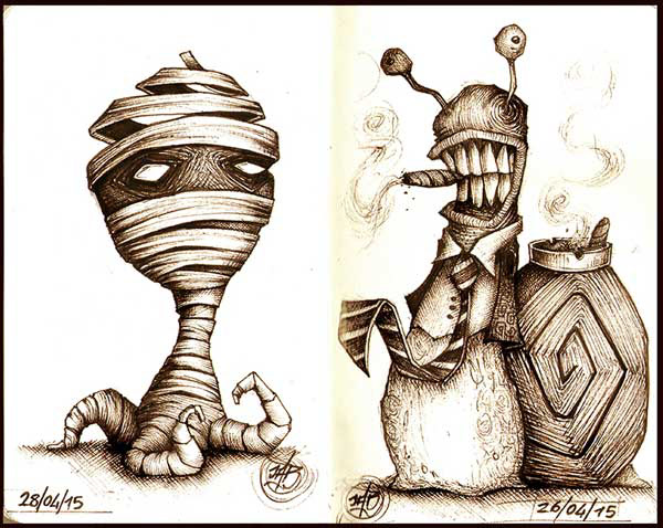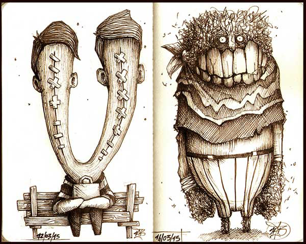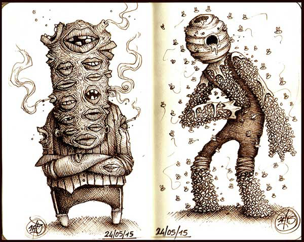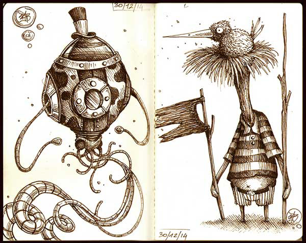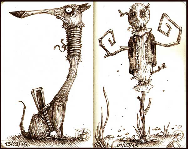 Series of quick concepts made with Sepia Pens on sketchbook 16x10 cm